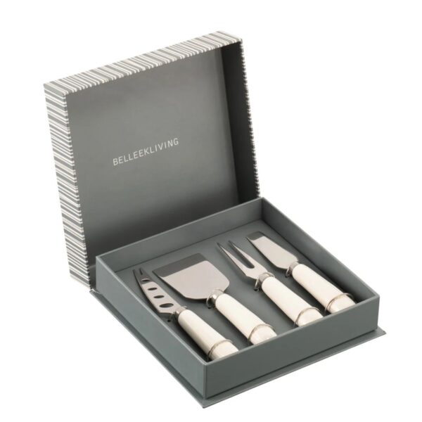 Dimensions: Plane Knife: 2.2cmW x 14.5cmL Open Blade Knife: 2cmW x 16cmL Cheese Fork: 2.2cmW x 14.5cmL Flat Cheese Knife: 4.7cmW x 14.5cmL