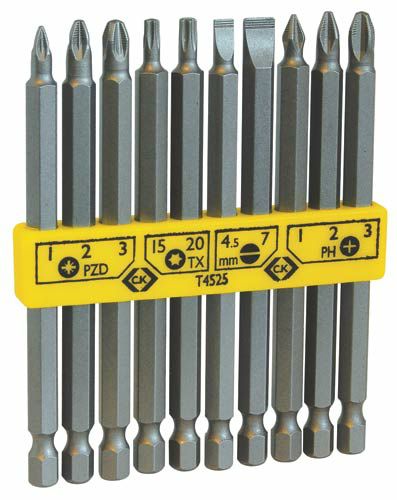 1 x screwdriver bits, slotted. sizes: 4, 5 & 7mm; PZ, sizes: 1, 2 & 3; PH, sizes: 1, 2 & 3; TX, sizes: 15 & 20.