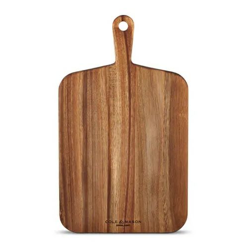 Crafted from sustainable Acacia wood, this Cole & Mason Barkway medium chopping board with handle has a classic silhouette with softened corners that is both timeless and functional. This medium board is perfect for many food prep tasks such as chopping, crushing, slicing and dicing but is equally at home as a serving platter for meats, cheeses and breads.