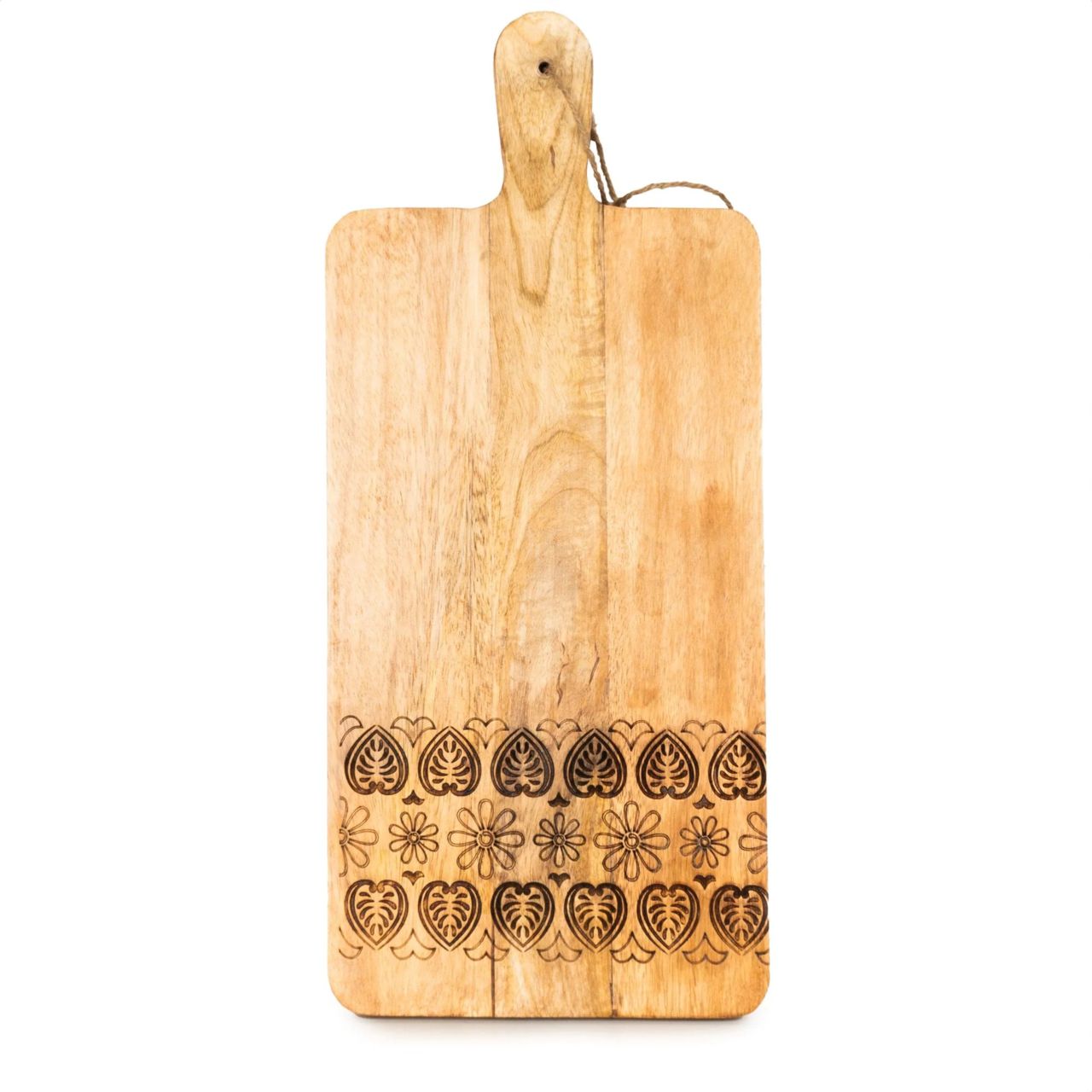 Elevate your serving style with the Large Mango Wood Paddle Board featuring a Meze Design, a set of four that blends functional artistry with natural beauty. Each board is meticulously crafted from durable mango wood, celebrated for its robustness and unique grain patterns. Adorned at the bottom with an intricately engraved meze-inspired pattern, these boards make for a striking display of hors d’oeuvres or as a charming decorative kitchen accent. Complete with a rustic twine loop for convenient hanging, this paddle board set is not only a practical addition to your culinary arsenal but also a conversation starter at any gathering.