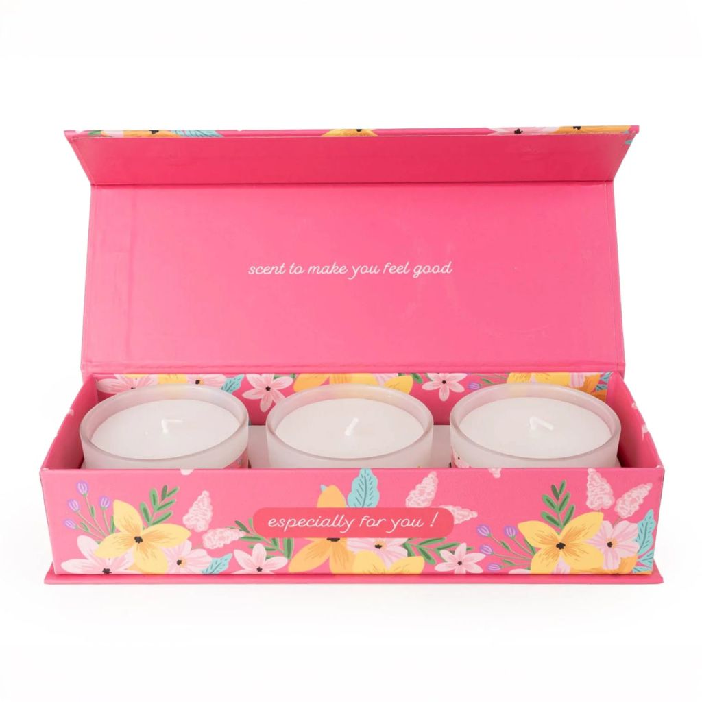Celebrate special moments with our celebratory set of 3 Candle Gift Set in a pink floral print. This elegant set features three beautifully kashmir and fig scented candles, each housed in a charming floral pink container. Perfect for celebrating loved ones, these candles create a warm, inviting atmosphere while adding a touch of sophistication to any space. Ideal for gifting and celebrating life’s milestones.