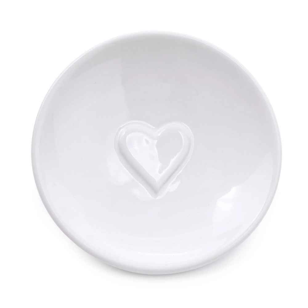 Our gorgeous white soap dish with an embossed heart in the centre is precisely spherical. We finished them with a glaze to give them a wonderful sheen.