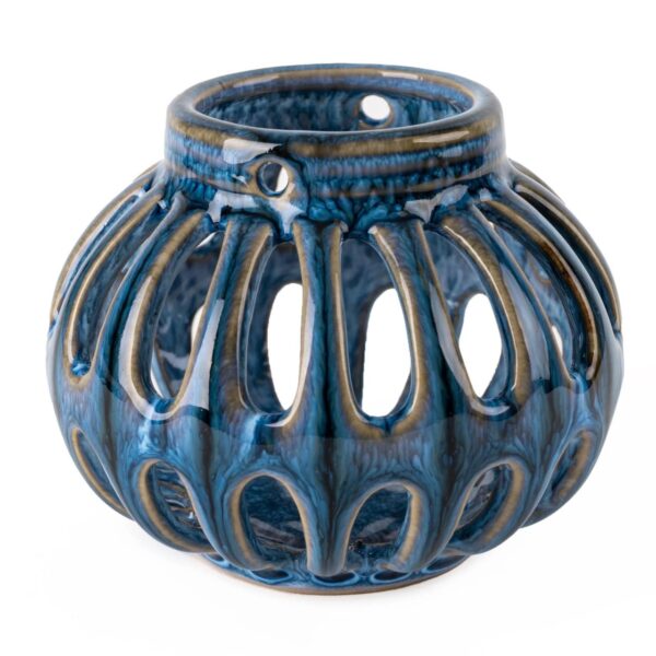 The Tealight Holder in Reactive Glaze Blue features a stunning, dynamic finish with deep blue hues and a distinctive, textured glaze. Its reactive glaze technique creates a unique, glossy effect that adds a touch of elegance and sophistication to any space. Ideal for creating a warm, inviting atmosphere with the soft glow of tealight candles.