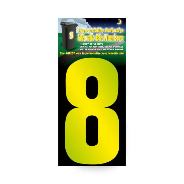 Classic Sign?s Wheelie Bin Numbers are world famous. These stickers are made of a durable, weather-resistant material and can be applied to any smooth surface.These self adhesive HIgh Visability Reflective Wheelie Bin Sticker Numbers are 17cm high and make the perfect partner for our best-selling wheelie bin decorative kits, adding a flourish of individuality to your refuse receptacle.