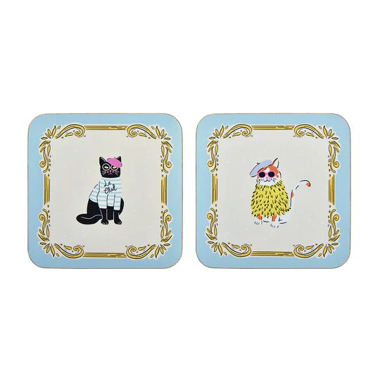 Cool Cats draws inspiration from 60s fashion, featuring a kitschy and fun design with vibrant pops of pink and yellow. The playful imagery showcases mischievous cats dressing up and enjoying themselves, capturing the lively spirit of the era while adding a whimsical touch.