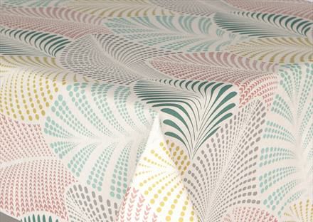 50% Cotton / 50% polyester table covering with a resin treatment which protects against stains without losing the textile appearance.