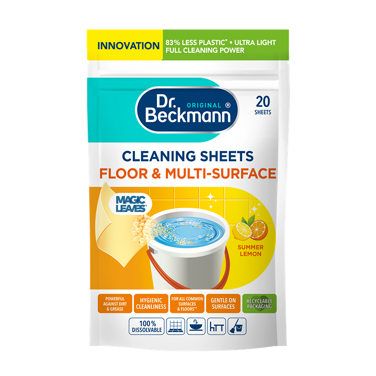 Dr. Beckmann all-purpose cleaning sheets revolutionize household cleaning: The ultralight sheets are 100% dissolvable and act powerfully against dirt and grease. This is easily done: Just drop & mop! The sheets are suitable for all common surfaces and floors except waxed or oiled surfaces. They leave a fresh scent of summer lemon.