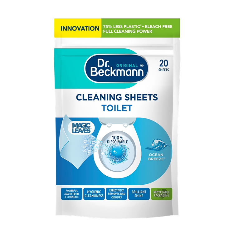 Dr. Beckmann toilet cleaning sheets revolutionize toilet cleaning: The ultralight sheets are 100% dissolvable and act powerfully against dirt, limescale and urine stains. This is easily done: Just drop, brush & flush. The sheets also remove bad odours and leave a fresh scent of ocean breeze.