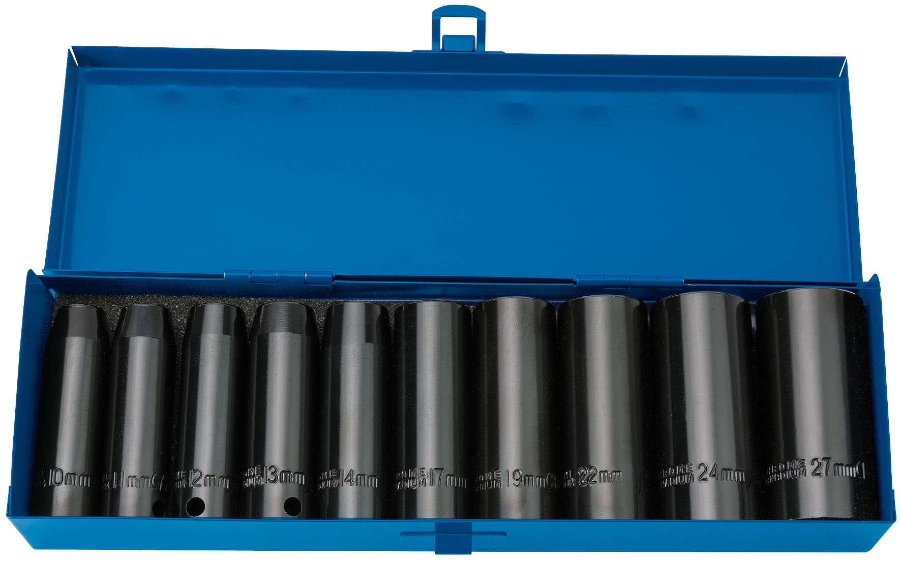 10x Sockets: 10, 11, 12, 13, 14, 17, 19, 22, 24, 27mm