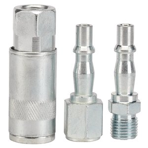 Quick release action coupler and male and female threaded adaptors, providing the user with maximum versatility. Display packed.1 x 1/4″ BSP tapered male thread screw adaptor