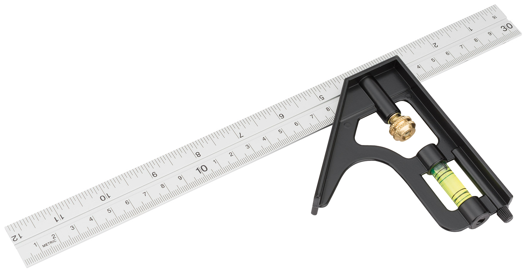 Matt black metal stock with polished faces, brass adjusting screw, spirit level and scriber. Aluminium blade graduated (on both sides of the blade) metric on one edge and imperial on the other. Display packed.