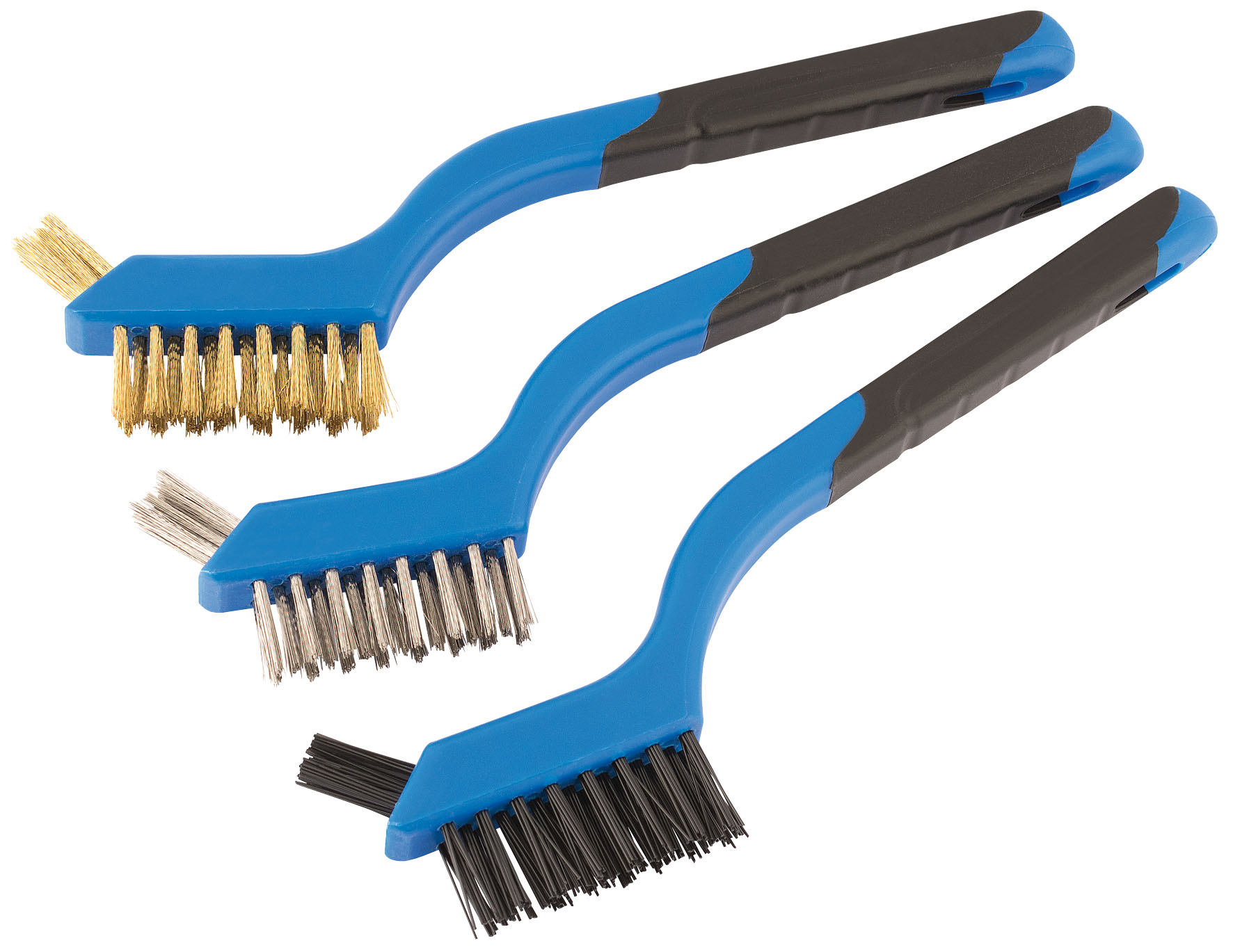 Three 210mm brushes fitted with either robust Nylon, Stainless Steel or Brass bristles, capable of delivering a vigorous scrub and clean. Each brush is attached with tip bristles for hard to reach areas and a soft grip handle.