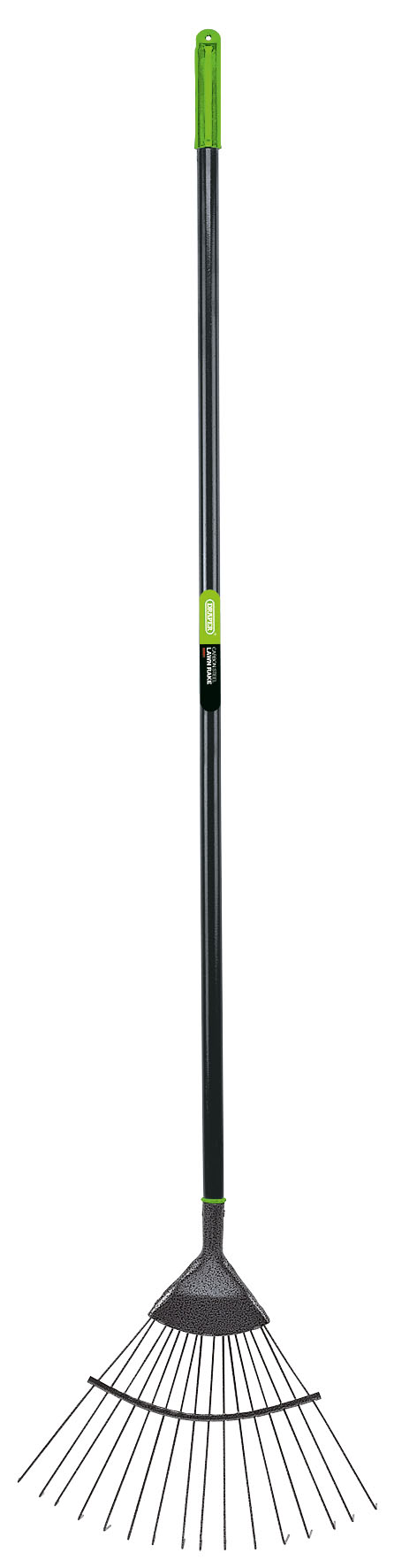 Sixteen flexible round steel tines with plastic coated finish. Head securely fixed to tubular steel handle. With black plastic hand grip with hang hole. Sold loose.Width: 400mm