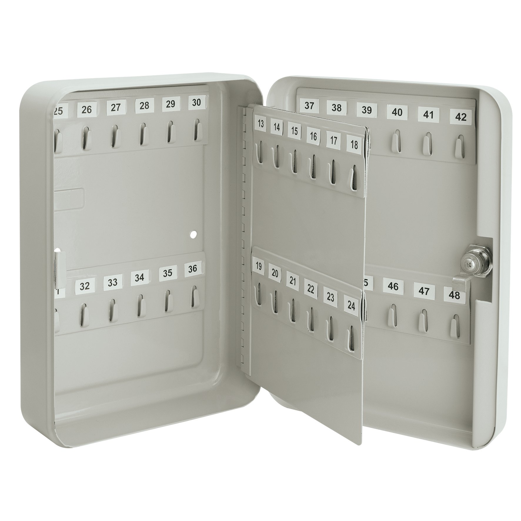 Heavy duty steel cabinet with lock for hanging up to 48 keys. Supplied with labels, wall fixings and two keys. Display carton.