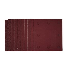 This pack of 1/4 sanding sheets (115 x 105mm) are made from premium quality aluminium oxide that is resin bonded to provide improved grain adhesion, anti-static qualities and long-lasting performance. The heavy-duty E-Weight backing paper makes the sanding sheet more durable –– able to withstand the toughest jobs. The hook and loop backing offers decent adhesion to facilitate the fast changing of sanding sheets. The eight pre-punched 8mm holes improve dust extraction. Ideal for sanding and finishing wood, metal, aluminium alloy, painted surfaces, plastic and fillers. Compatible with most 1/4 sanders with hook and loop including Stock No. 57691.1 x 1/4 Sanding Sheets with Hook and Loop, 115 x 105mm (Pack of 10)Size: 115 x 105mm