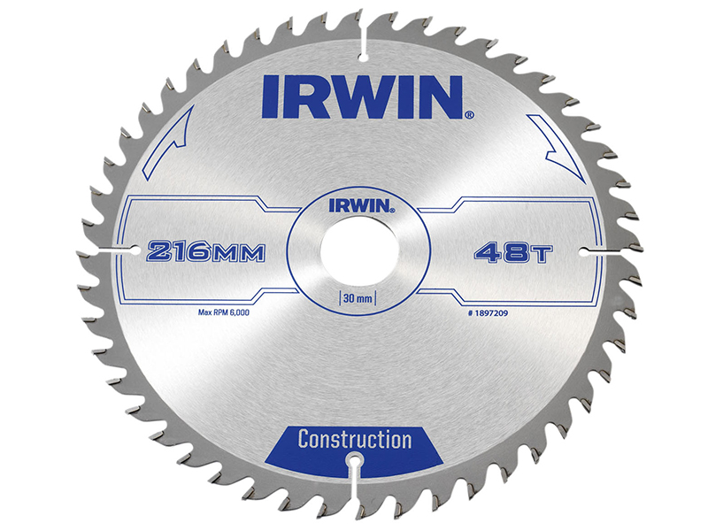 IRWIN General Purpose Table & Mitre Saw Blade with construction grade tungsten carbide tips that retain their edge for longer and are resharpenable. Expansion slots help to dissipate heat and prevent warping. The blades have a fully hardened plate that runs truer for longer and with more accuracy.