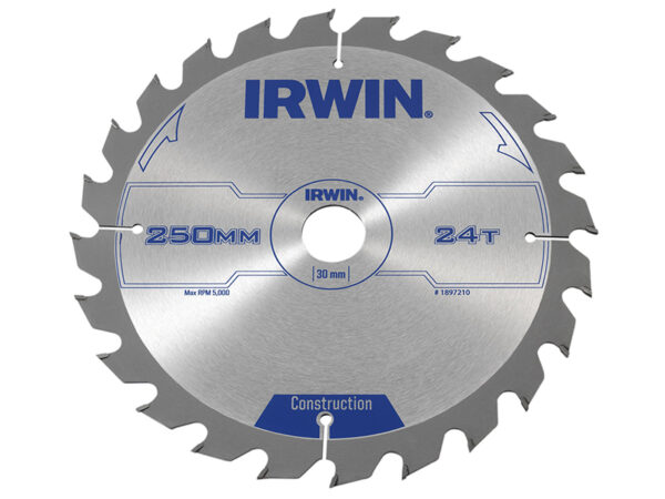 IRWIN General Purpose Table & Mitre Saw Blade with construction grade tungsten carbide tips that retain their edge for longer and are resharpenable. Expansion slots help to dissipate heat and prevent warping. The blades have a fully hardened plate that runs truer for longer and with more accuracy.