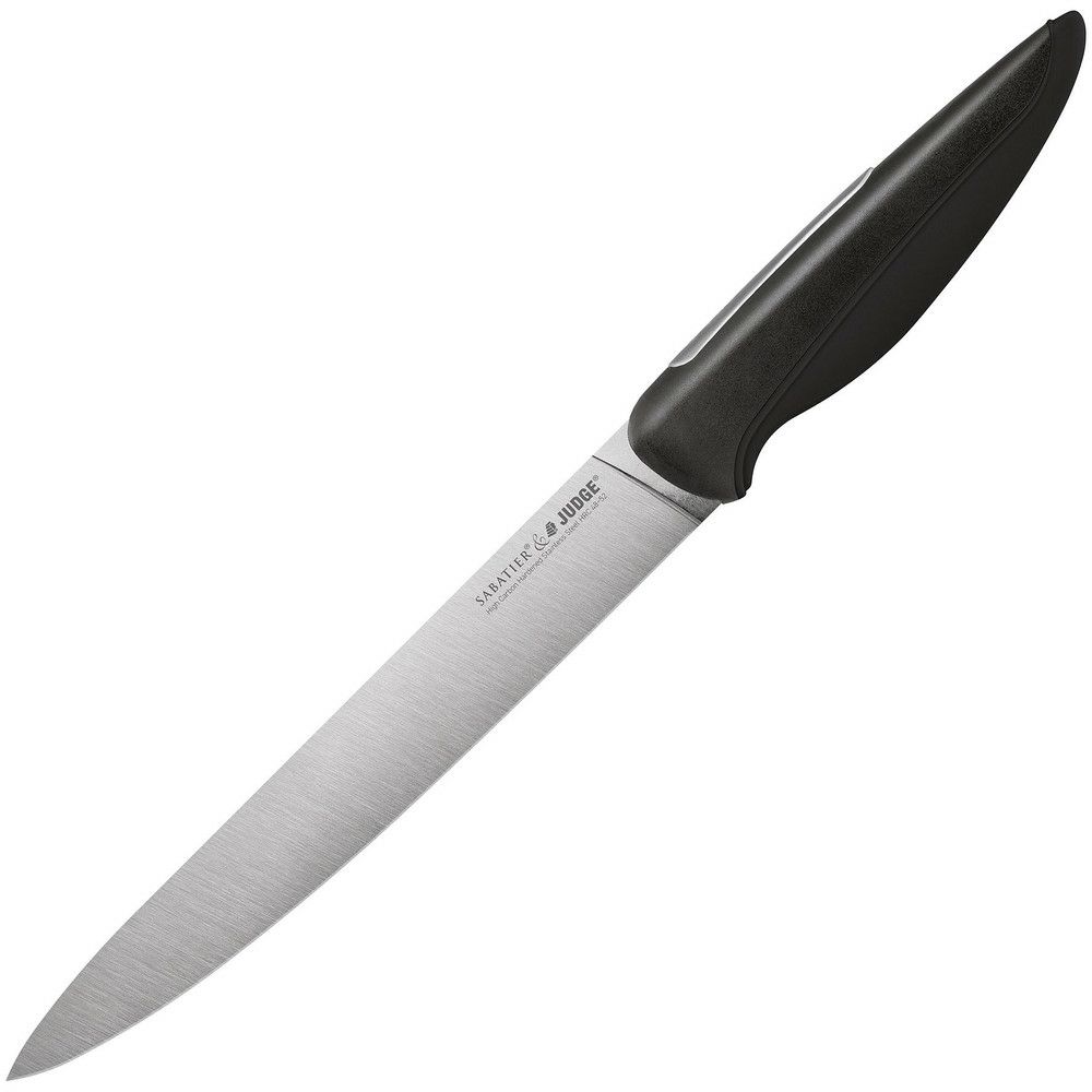 With its precision ground blade, the Judge Sabatier IP Carving Knife makes quick work of carving and slicing roast beef, ham, turkey and more. The comfortable handle ensures a safe grip and the stainless steel blade lets you tackle a range of tasks from chopping herbs to slicing fruit and vegetables. A modern twist on a classic knife. High-grade stainless steel blades with multi tactile handles for a sure grip. Serrated edge for smooth slicing of breads. Easy to sharpen.
