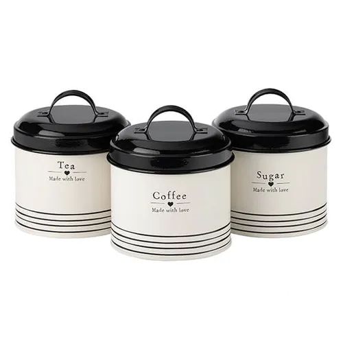 The set includes 1 x tea storage tin, 1 x coffee storage tin and 1 x sugar storage tin, supplied with a grey sleeve.