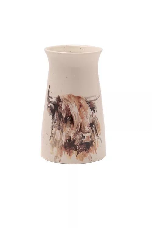 Presenting the Meg Hawkins small ceramic vase featuring an adorable Highland Cow design. This captivating vase proves to be an attractive supplement for homes that encompass both timeless and contemporary styles. Meticulously fashioned from speckled ceramic in a pristine white hue, the petite vase elegantly highlights a gloss finish and a captivating highland cow depiction by Meg Hawkins. Its generously sized opening offers ample room for showcasing exquisite arrangements of flowers, enabling the creation of stunning floral presentations that enhance the aesthetic of any living space.