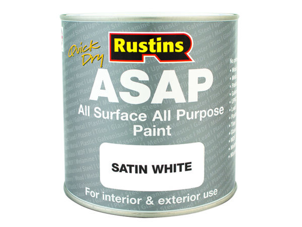 Rustins Quick-Drying All Surface All Purpose (ASAP) Paint is a water-based paint that dries to a satin finish. It resists flaking or peeling because of its flexible capabilities.