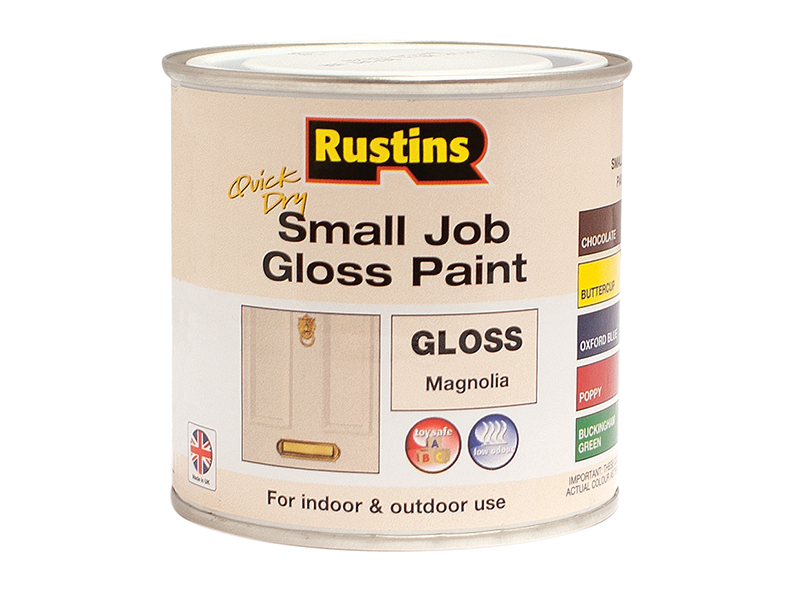 A range of full gloss paints for small projects including a white primer and undercoat.