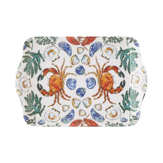 Glistening lobsters and crabs, shimmering mussels and clams hide amongst swirls of seaweed in this watercolour painted design. The artwork has been created as a contemporary mirror image, a kaleidoscope of pattern for modern kitchens and seafood lovers. While the imposing claws of the lobsters and crabs are the focal point of this design, the seaweed tendril reverse pattern with its little hidden clams adds delicacy. The aquatic teal green trims makes the vibrant orange shellfish and iridescent blue mussels really pop with colour.