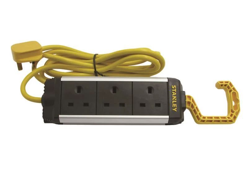 STANLEY 3-Gang Powerboard with Foldable Hook for easy attachment from ladders, scaffolds or ground points. The hook folds back for easy storage. It has a durable construction with bumpers for added protection. The high visibility, yellow cable increases job site safety. Fitted with strain relief on cable exit to protect from stress and breaking.