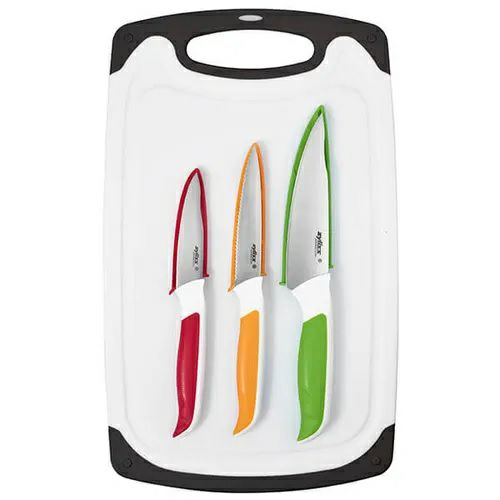 The knives all feature colour coded comfort handles for maximum grip and full control when in use. The non-slip grip handle on the chopping board provides a firm grip even with wet hands.